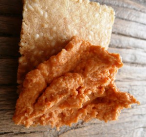 Je vous propose donc aujourd’hui deux recettes pour le prix d’une: un hummus aux tomates séchées accompagné de crackers au sésame.