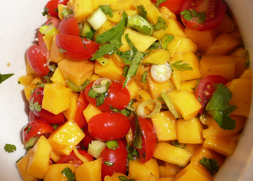 Cette salsa peut se préparer avec des tomates normales. Je préfère utiliser les tomates cerise pour leur goût un peu plus sucré mais surtout pour leur côté croquant qui contraste bien avec le moelleux de la mangue.