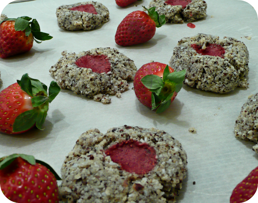 Tags: biscuits, cru, cuisine sans gluten, fraise, amande , noisette, noix de coco, végétalien