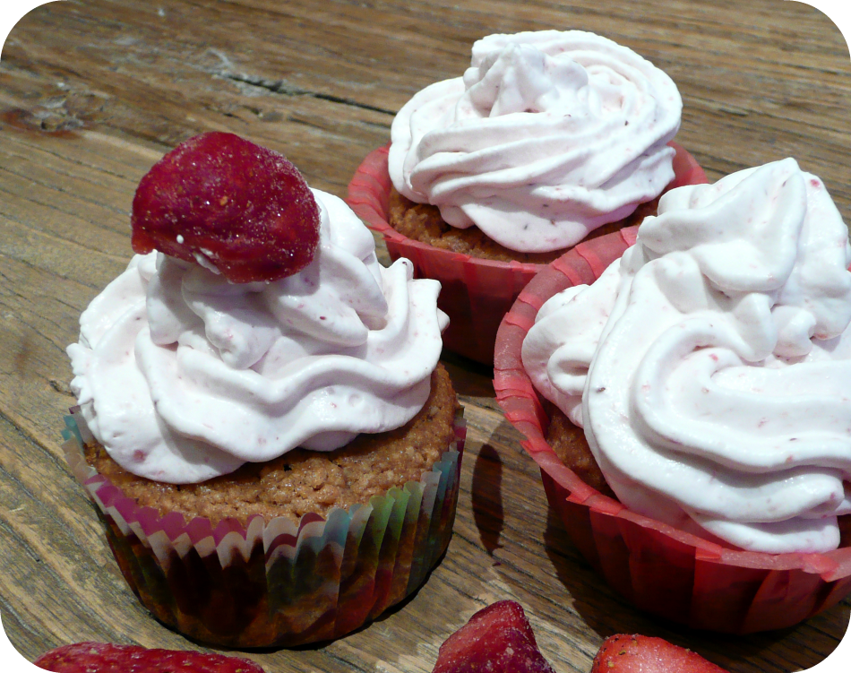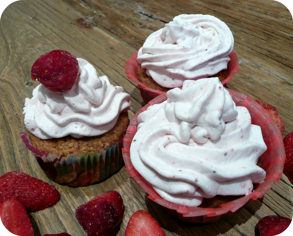 Aujourd’hui cupcakes à la fraise, avec glaçage chantilly de coco aromatisée à la fraise, une version paléo, IG bas… Mais surtout une version express: on mélanmge tout dans un bol et hop fini 🙂